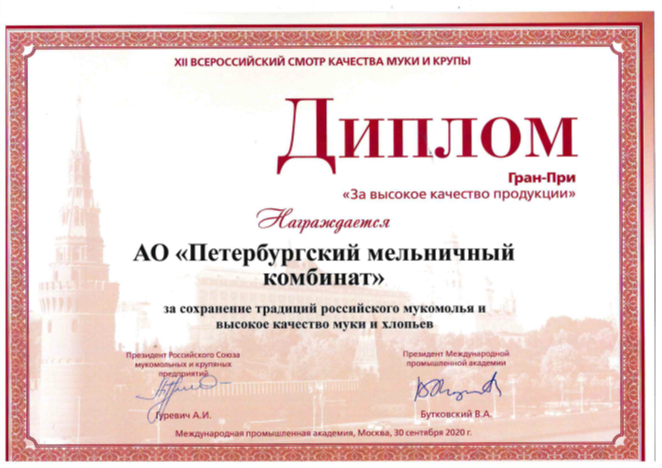 ГРАН-ПРИ «За высокое качество продукции» – за сохранение традиций российского мукомолья и высокое качество муки и хлопьев