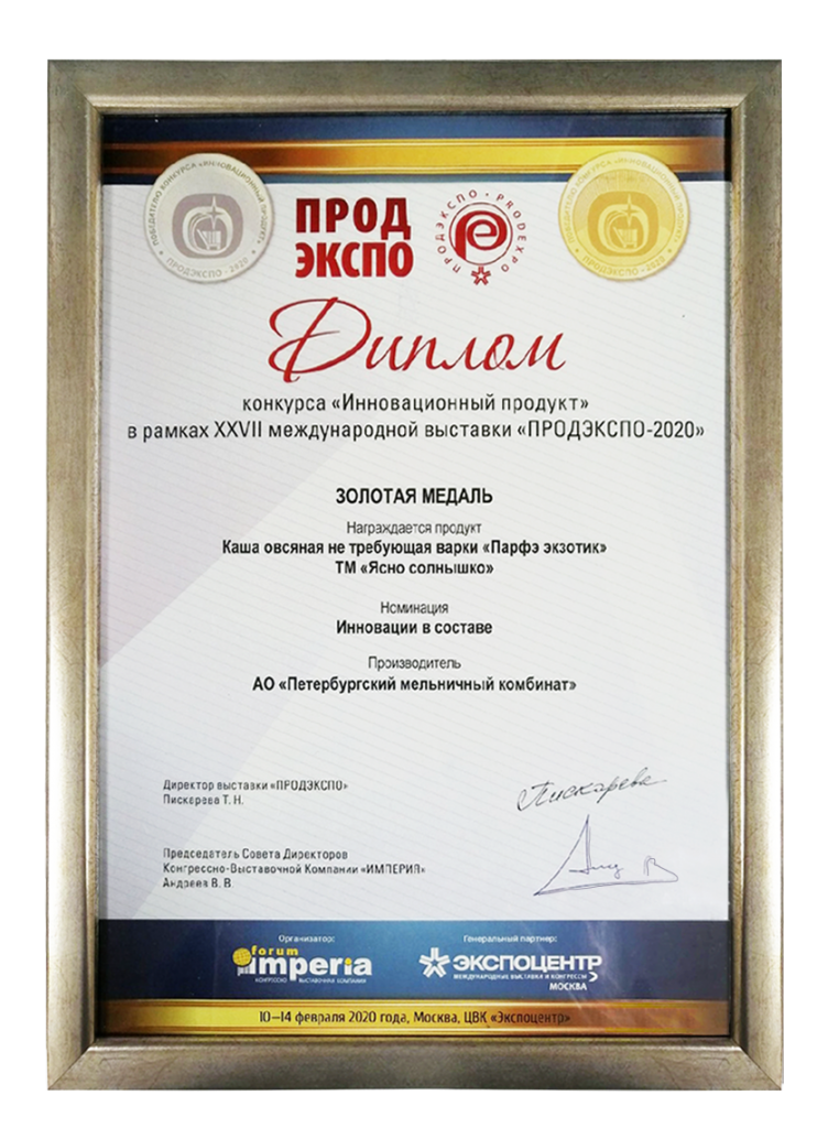 Диплом и золотая медаль конкурса «Инновационный продукт» в рамках XXVII международной выставки «ПРОДЭКСПО -2020». Каша овсяная «Парфэ экзотик»